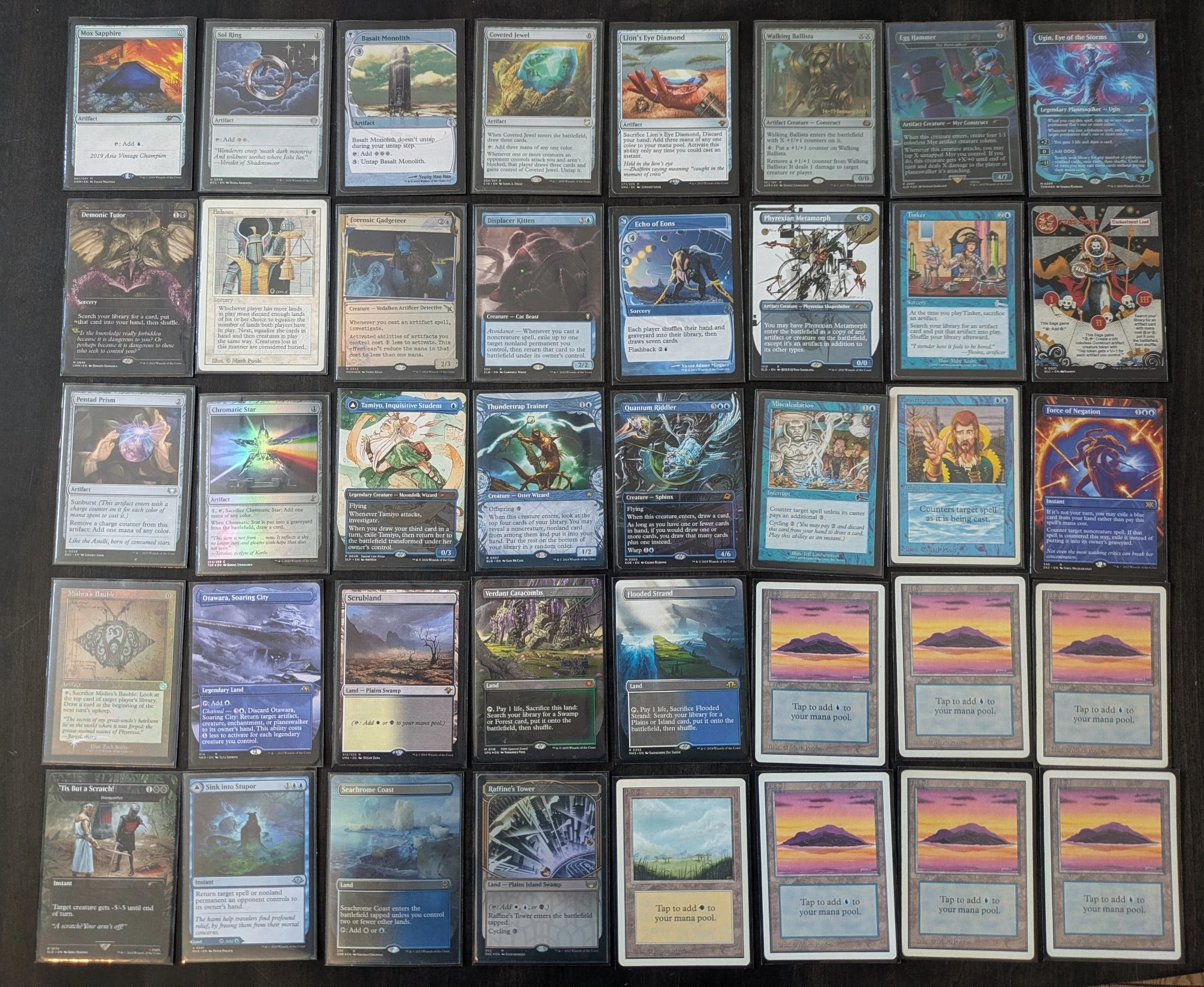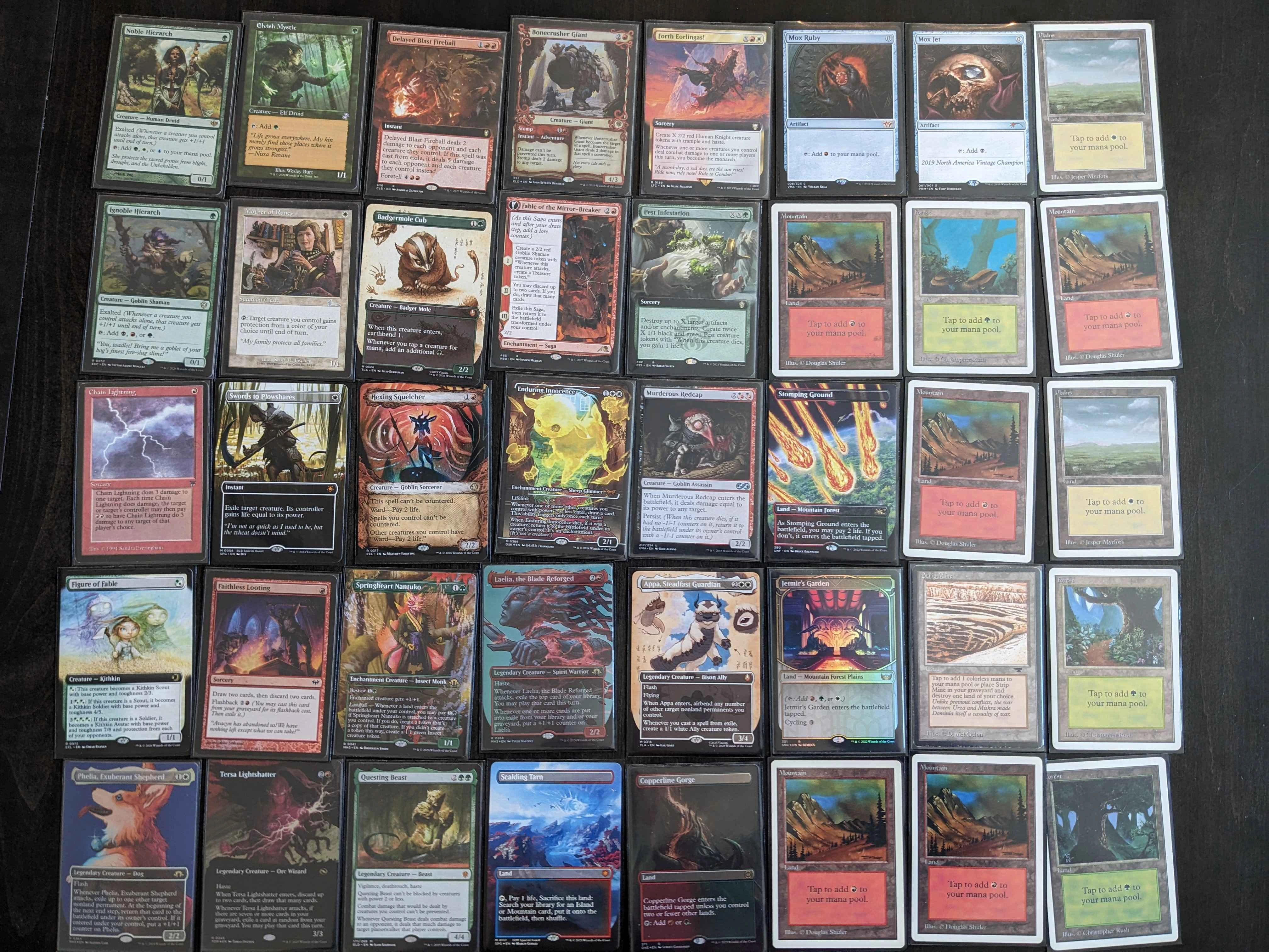 As you can see, I've leaned into the Booster Fun treatments. I'm using lots of full art cards, showcase frames, Secret Lairs, and Universes Beyond. I've also printed proxies of Magic Online Vintage Masters versions, Eternal Weekend prize arts, and other "modern frame" versions of reserve list cards. There are no custom proxies (every card reflects an object that WotC has produced in some form) so there are a handful of cards that have never received a modern frame treatment.