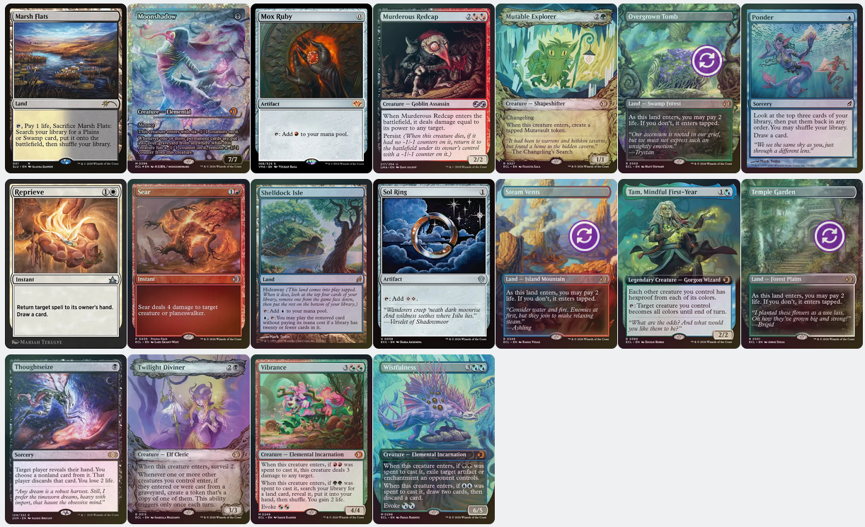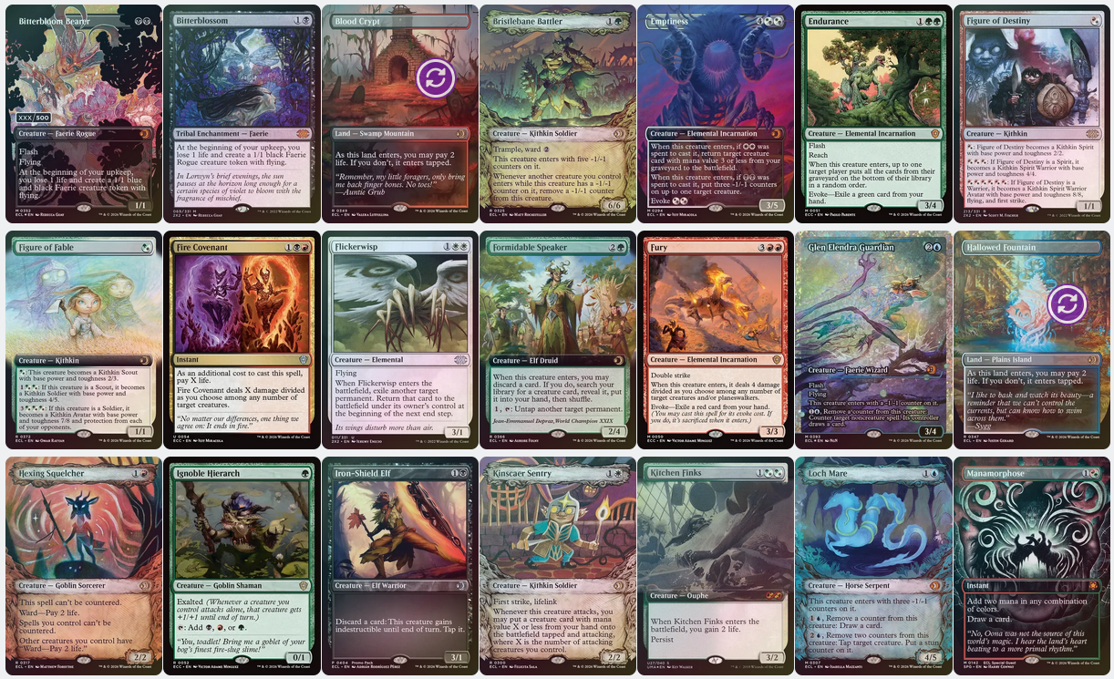 When possible, with the help of The Multiverse Project, I also match card versions to the current set. For Meetup IV, the most recent update is for Lorwyn Eclipsed. I've identified every card in the cube that has an art version from the planes of Lorwyn or Shadowmoor. These specific prints are featured in this iteration of my cube.